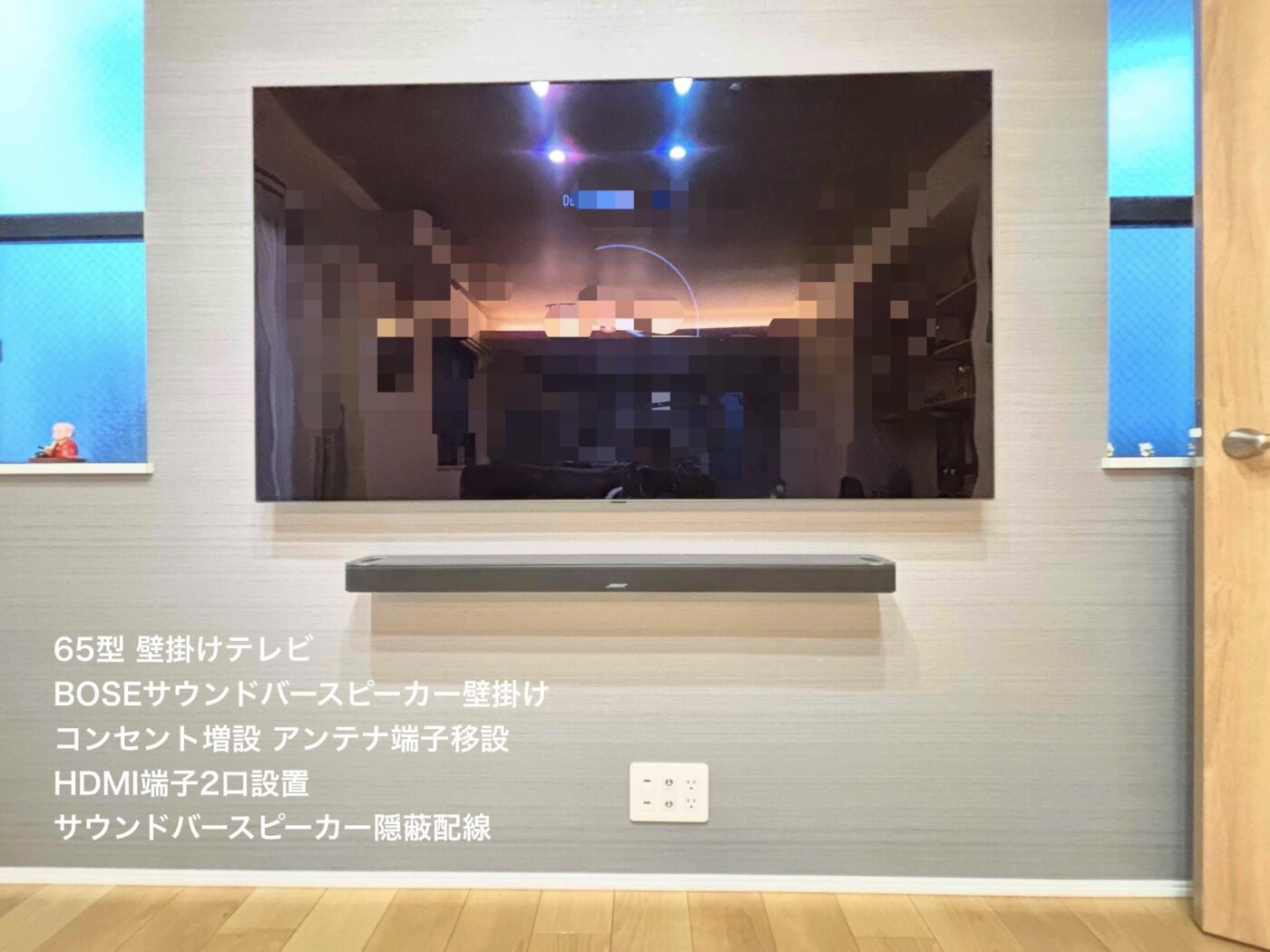 ¥ 62,700(税込) 戸建て住宅 (2026年4月以降 費用の改定がございます) 65型壁掛けテレビ基本費用 ¥22,000(税込) 壁掛け金具 角度固定式 ¥5,500(税込) コンセント増設アンテナ端子移設¥6,600(税込) サウンドバースピーカー壁掛け¥8,800(税込) サウンドバースピーカー配線隠蔽 ¥4,400(税込) サウンドバースピーカー壁面補強 ¥4,400(税込) HDMI埋め込み端子2口¥11,000(税込)